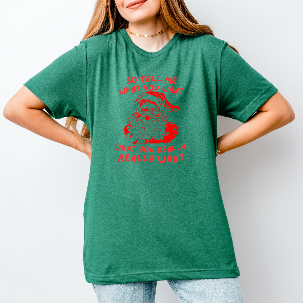 So Tell Me What You Want Santa T-Shirt Make a bold statement this holiday season with this playful Santa-themed tee. Perfect for those who appreciate witty humor and festive flair, this shirt combines classic Christmas spirit with a cheeky twist. The eye-catching design works as a conversation starter at holiday gatherings, office parties, or casual winter outings. Crafted for comfort and durability, it's an ideal gift for anyone with a sense of humor or a go-to piece for your own seasonal wardrobe rotation.